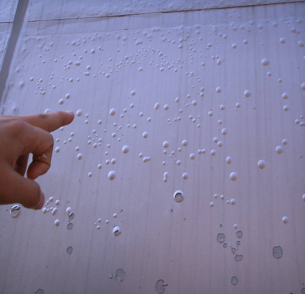 3、漆膜封閉性好,附近窗臺(tái)、雨盆板、樓面等 有水滲入墻體內(nèi),氣溫高時(shí)蒸發(fā)不出,聚集后頂起涂層;